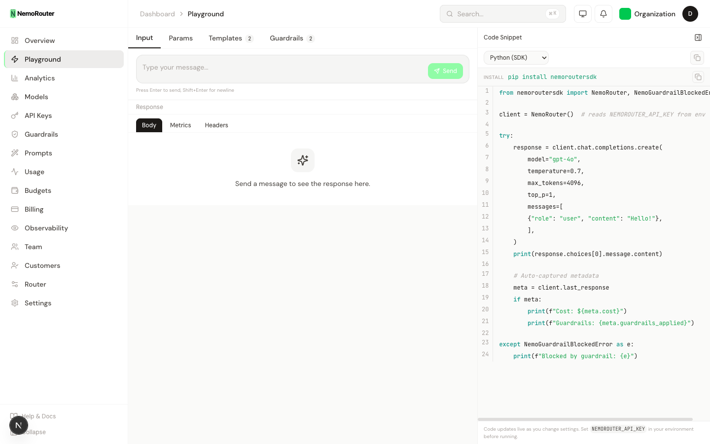 Chat with 200+ models, see real-time cost tracking, guardrail enforcement, and prompt template injection — all in one playground.